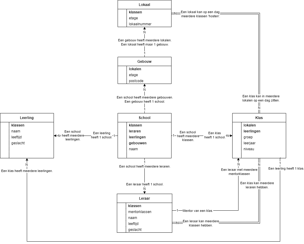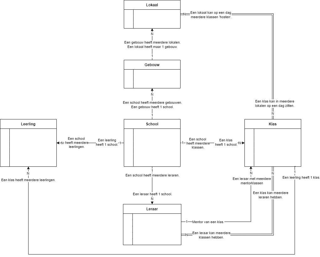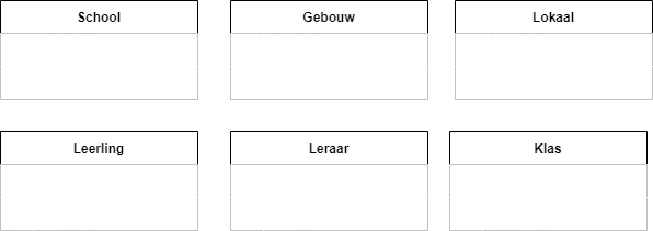 (vb. klas 1 havo A heeft het 1e uur Duits in lokaalnr x en 2e uur Wiskunde in lokaalnr x) - Een leerling heeft een naam, leeftijd, geslacht en zit in één unieke klas.